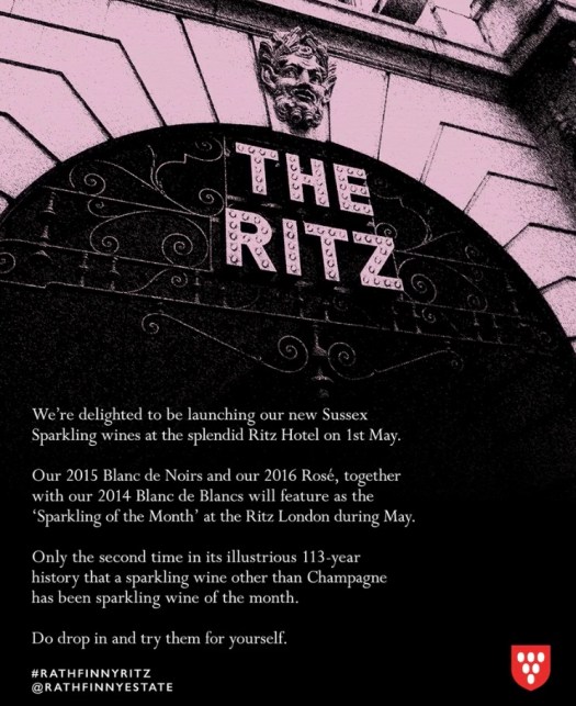 The launch is at the Ritz in London. The Ritz is one of the most iconic hotels in the world so this truly is a fabulous achievement for Rathfinny as the Ritz are having their new 2015 Blanc de Noirs as their wine of the month in May.